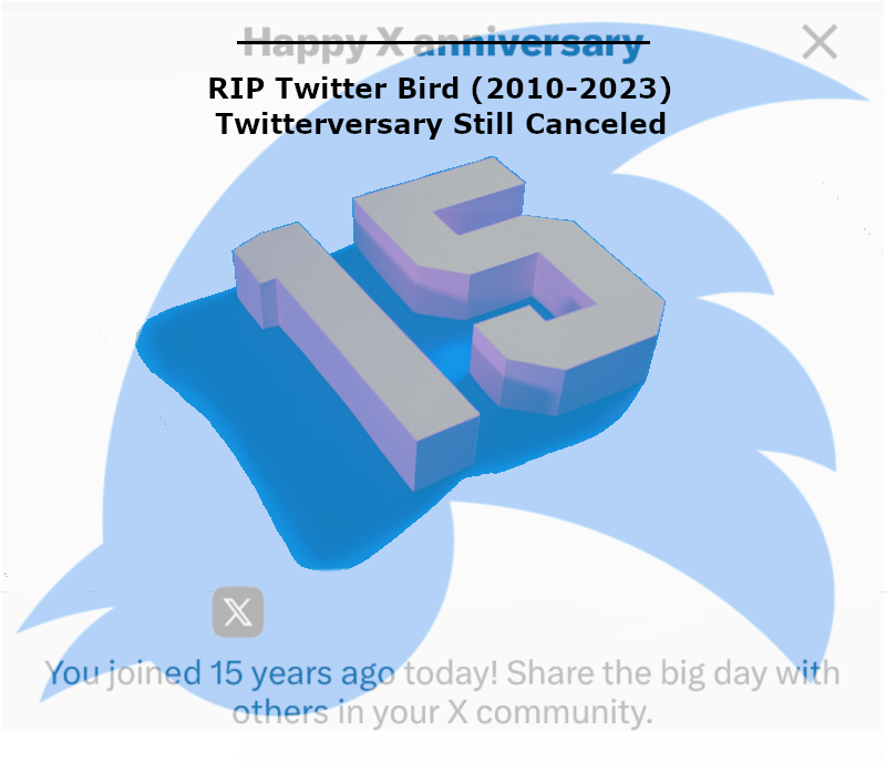 Starting in 2010, I would annually announce/celebrate my Twitterversary at the beginning of October with a tweet, and on some years, a Twitterversary blog post. This year, with the owner of Twitter deciding to kill off the Twitter bird, and my being barred from using Twitter in any productive way, my Twitterversary is canceled for 2023. For me, the Twitter that I had known and found useful is now gone.