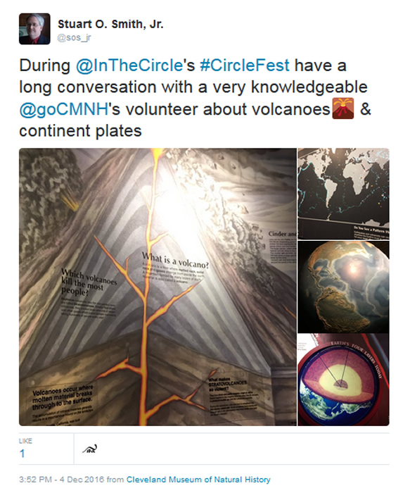 During @InTheCircle's #CircleFest have a long conversation with a very knowledgeable @goCMNH's volunteer about volcanoes & continent plates pic.twitter.com/2H9UFv8K4Q