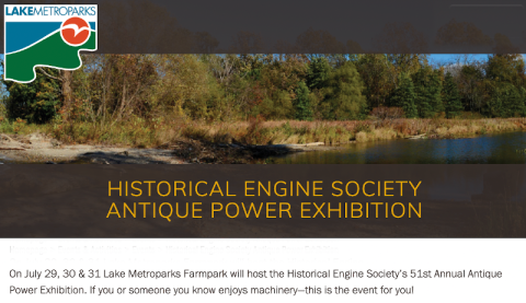 The Historical Engine Society's 51st Antique Power Exposition rumbles into Farmpark Friday through Sunday, July 29 - 31, from 9 am to 5 pm.
