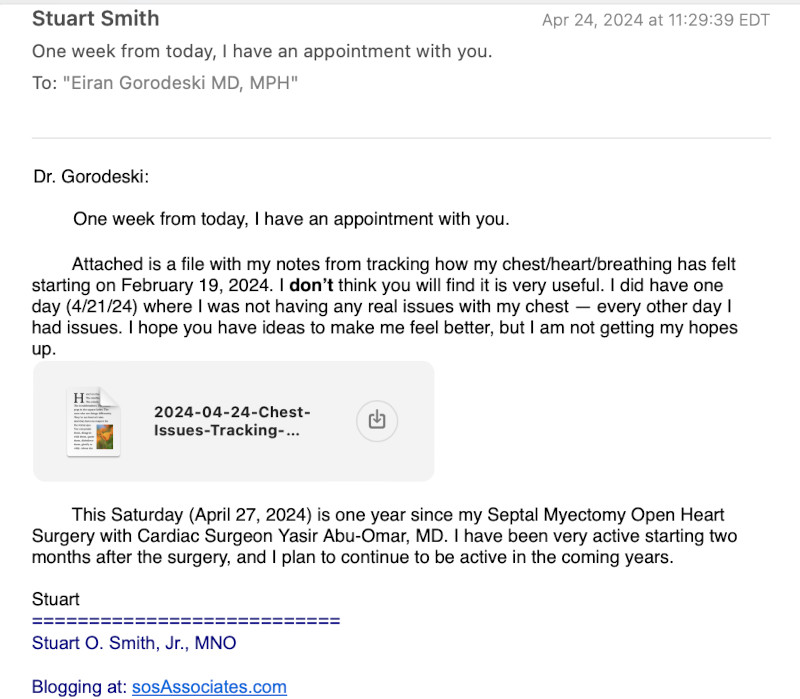 One week before my appointment, I sent Dr. Gorodeski my chest/heart/breathing tracking notes. I also noticed that it was coming up on one year since my septal myectomy open heart surgery.